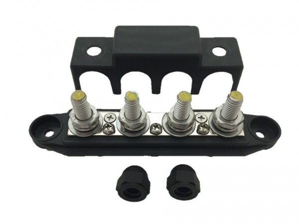 M8 Aansluitstud 4-weg met Afdekkap voor max 250A op 12 V, is leverbaar in de kleur rood en zwart.