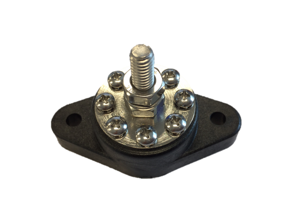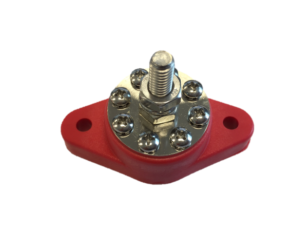 VTE aansluitstud met een m8 bout in het midden met 8 aansluitpunten rondom, leverbaar in rood of zwart.
