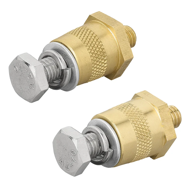 Accupolen set messing schroefbaar M8 met bout en ring. Schroefbare accupolen, Schroefpolen (-) en (+), Accupool set, Accupolen. Door gebruik te maken van deze combinatie, kunt u zowel een accuklem monteren, als een perskabelschoen op de kop van deze set. Hierdoor creëert u dus als ware een extra connectie mogelijkheid.