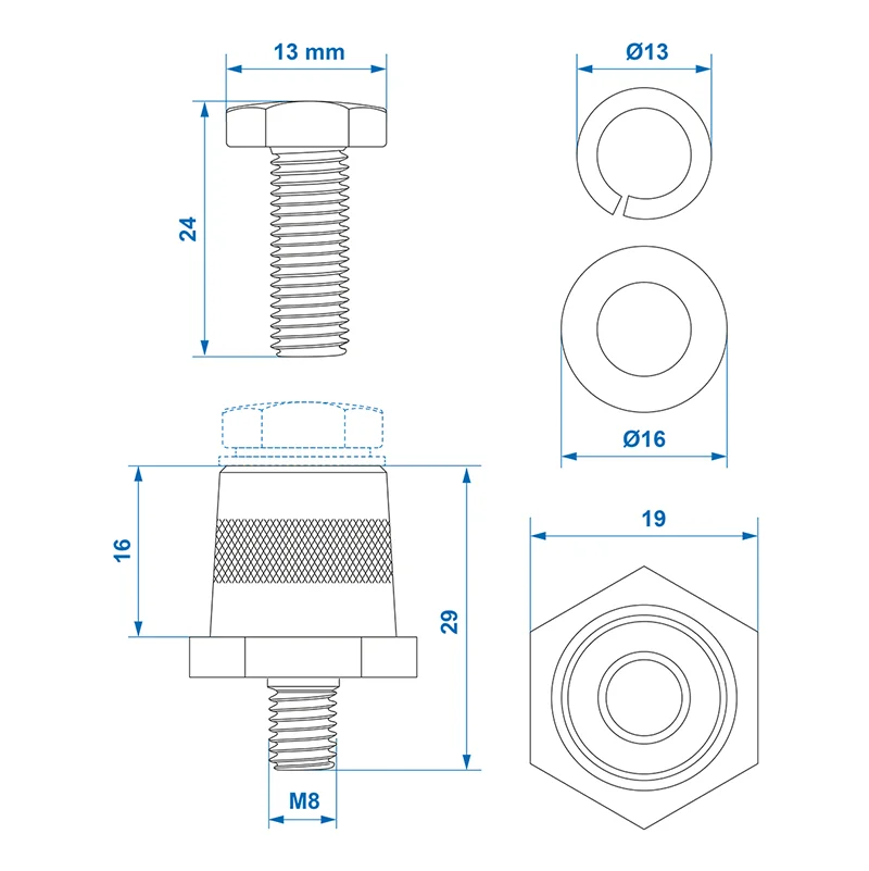 Accupolen set messing schroefbaar M8 met bout en ring